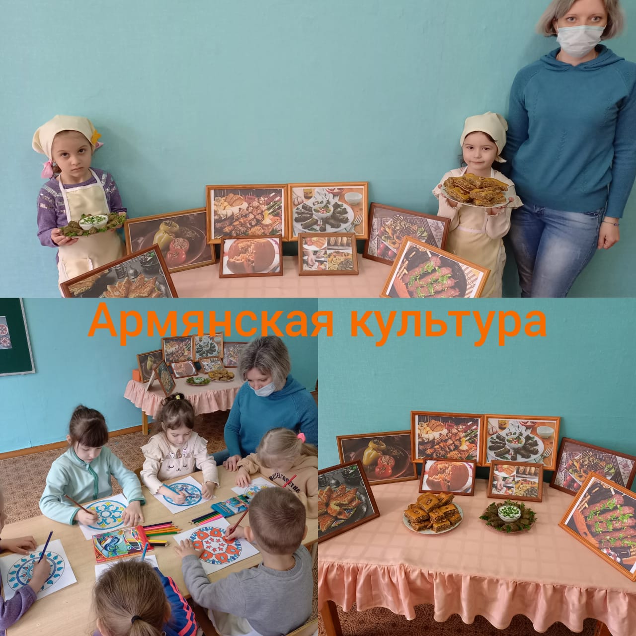 Воспитанники младшей и средней групп представили белорусскую и армянскую культуры, ребята рассматривали предметы быта, фотовыставку блюд национальной кухни.