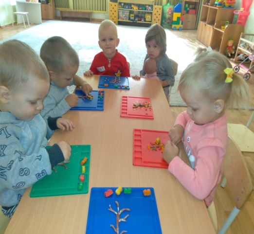 Мои малыши только - только делают свои первые творческие шаги, поэтому я подбираю самые простые методы и приемы, доступные для них. Из разноцветных комочков пластилина мои дети делают листочки и украшают ими деревья. Это отличный тренажер для маленьких пальчиков.