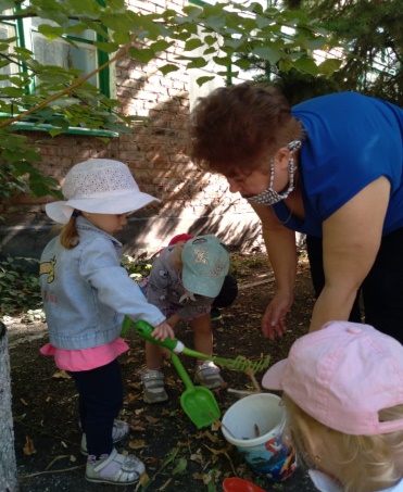 На прогулке мы рассматриваем листочки, играем с ними и трудимся.