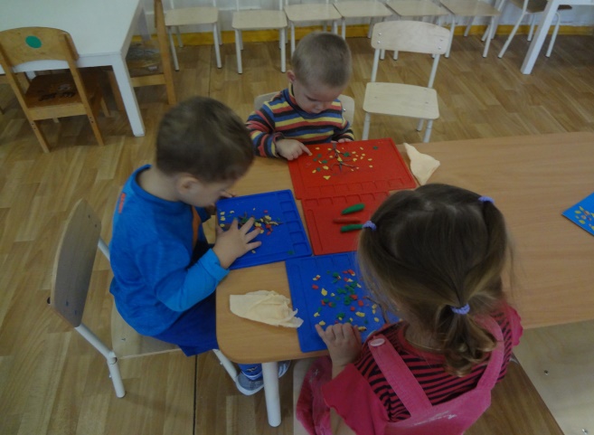 Мои малыши только-только делают свои первые творческие шаги, поэтому я подбираю самые простые методы и приемы, доступные для них. Из разноцветных комочков пластилина мои дети делают листочки и украшают ими деревья. Это отличный тренажер для маленьких пальчиков.