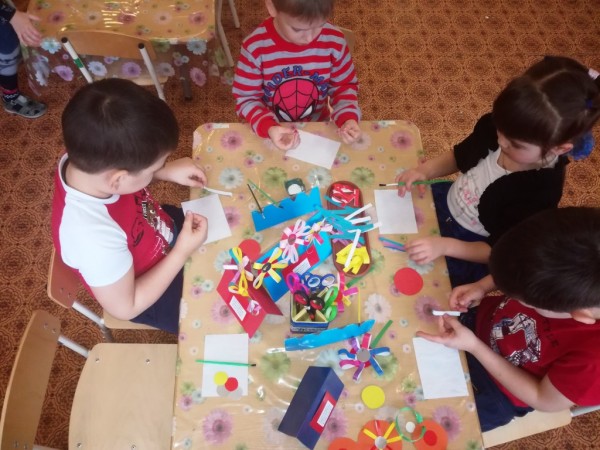 Творческая мастерская в группе работала плодотворно. Ребята с трепетом и любовью трудились над сюрпризами для мам и бабушек. Для сотрудников детского сада приготовили открытки-приглашения на весенний праздник 8-е марта. Праздник для милых женщин прошёл ярко и весело. Ребята с радостью приглашали на заключительный танец своих мам и бабушек.