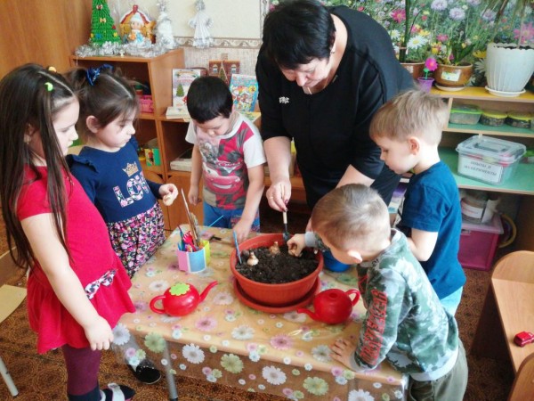 Дети играют в разные игры, решают логические задачи, разучивают песни и танцы. В экологическом уголке посадили лук и ухаживают за ним, ведут наблюдения.