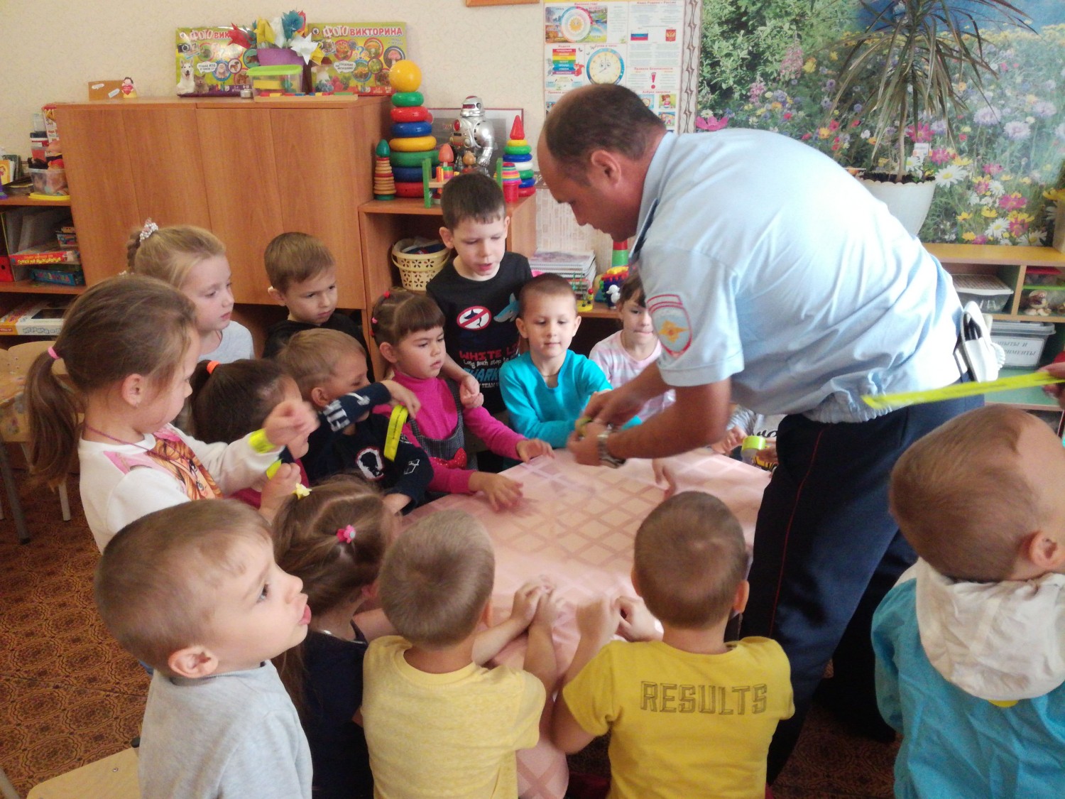 Совместно с инспектором ГББДД, Николаем Павловичем, провели в группе занятие "Заметный пешеход" по использованию световозвращающих элементов.