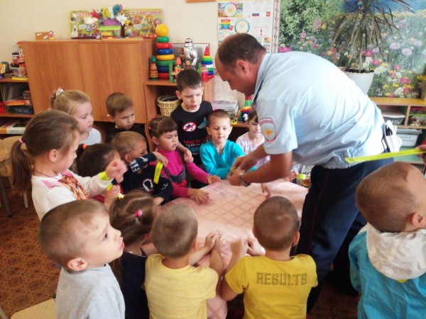 Совместно с инспектором ГББДД, Николаем Павловичем, провели в группе занятие "Заметный пешеход" по использованию световозвращающих элементов.