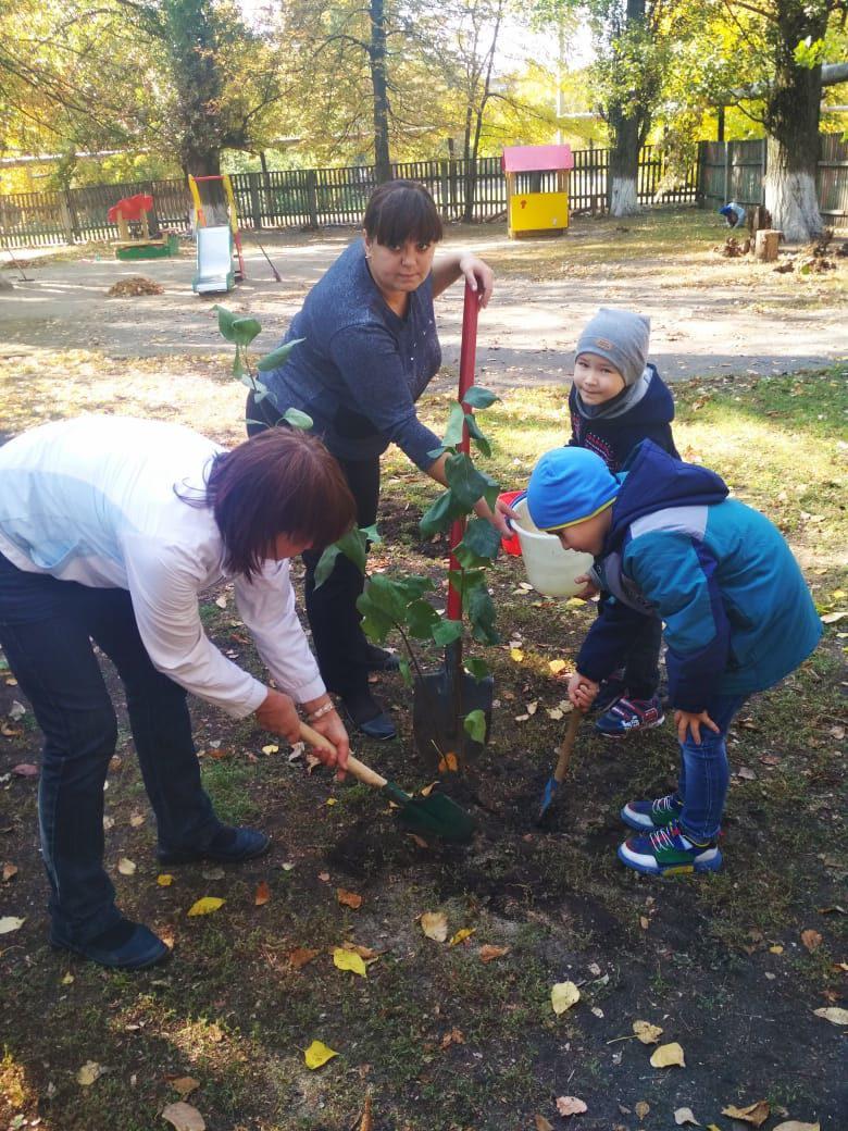 С большим удовольствием дети помогали копать ямки, придерживать саженцы,поливать. На территории детского сада появились замечательные насаждения, которые станут украшением в любое время года. Общими усилиями внесён вклад в сохранение окружающей среды родного города.